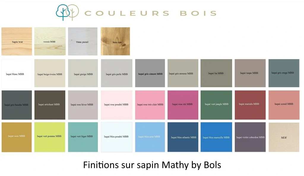 Vous pouvez le choisir en bois massif brut ou protégé par une des nombreuses laques à base d'eau (26 couleurs visibles dans le nuancier présent dans l'onglet "les détails techniques") proposées dans le nuancier ou avec un verni incolore ou une lasure blanc pastel !