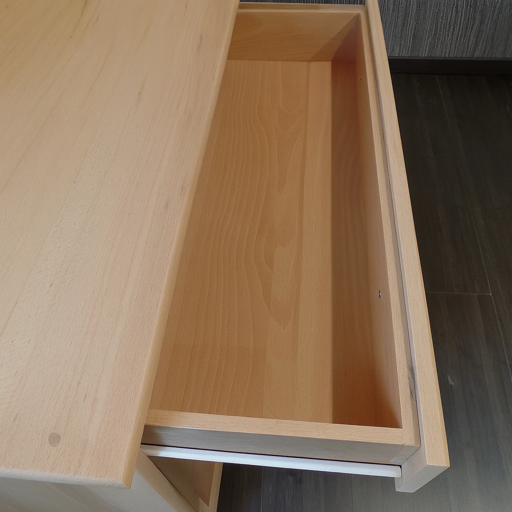 Sur la photo, la commode 4 tiroirs est en hêtre massif brut, sans finition. Vous pouvez aussi la commander en tilleul, au grain plus fin et moins résistant au poinçonnement, en frêne, plus marqué et tirant sur des tonalités jaunâtres ou encore en chêne massif.