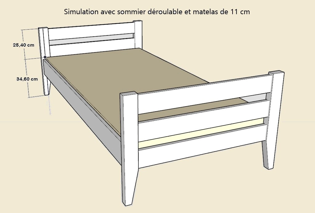 Pour les photos, j'ai réalisé le lit 90 cm Basile avec des planches et des plateaux de bois de hêtre brut et l'ai équipé d'un sommier déroulable de chez Mathy by Bols, en sapin massif non traité et tresses coton ainsi que d'un matelas de 11 cm d'épaisseur.