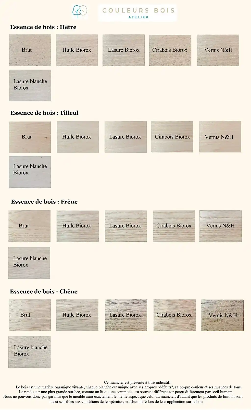A noter également : les produits de finition incolores ne couvrent pas le veinage du bois et peuvent ne pas être totalement uniformes car absorbés différemment selon les endroits.