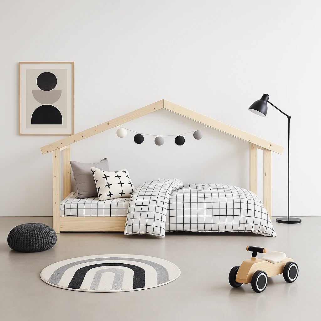 Très facile d'accès avec 6.5 cm entre le sol et le dessus du sommier et 2 cm sous ses traverses, ce lit cabane bois naturel bas est dôté d'une structure permetttant de créer un véritable cocon si vous décidez d'y ajouter des voilages ou des éléments de déco comme une guirlande lumineuse par exemple ou de rester très aéré si vous l'utilisez dans sa configuration d'origine.