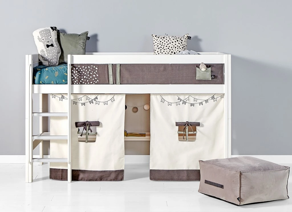 Vous cherchez un lit enfant mi hauteur en pin avec des rideaux pour que votre enfant puisse profiter d'un espace de jeux dans sa "cabane" ?