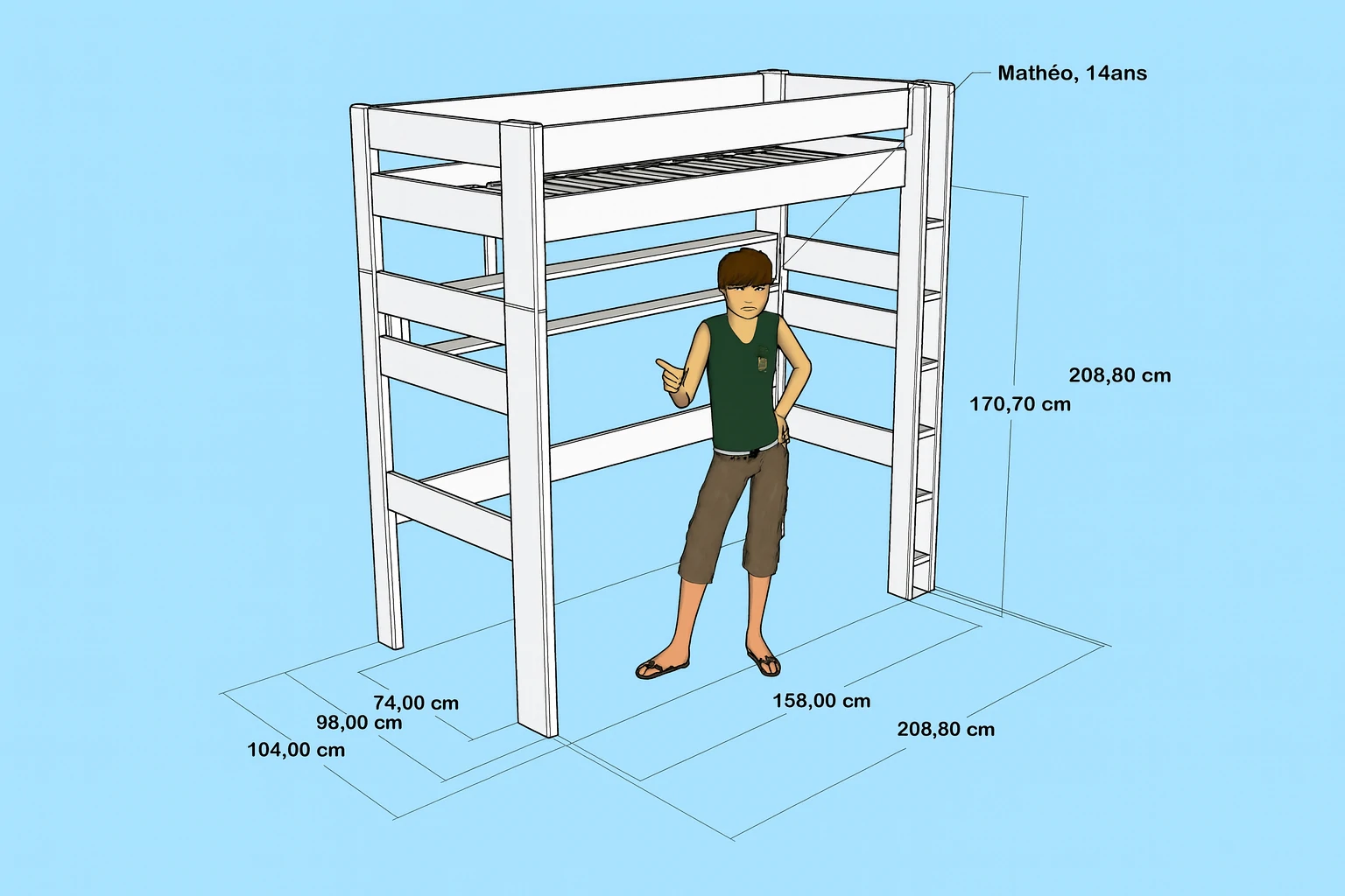 Si sa référence correspond à la hauteur en centimètres de ses montants, la hauteur sur matelas (15 cm d'épaisseur maxi pour respecter les normes de sécurité) de ce lit très haut sera d'environ 192 cm.